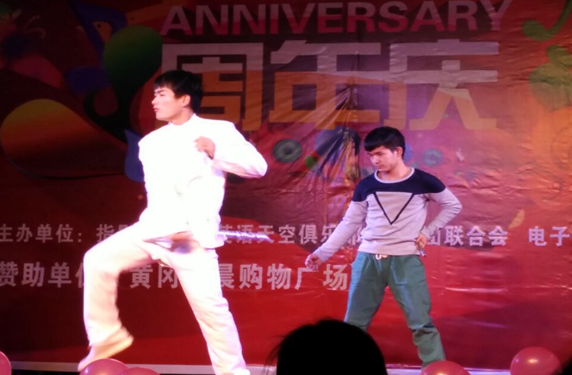 周年庆于七点正式开始,电子信息学院学工办江俊新主任和机电工程学院邱锐主任莅临观看,电子信息学院学生会干部也参加了本次活动。我院学生会积极维护活动秩序,活跃我院社团周年庆气氛,两社团为各位观众准备了水果。四位主持人幽默诙谐的主持为观众带来了阵阵欢声笑语。节目的内容多种多样,有舞蹈、歌曲、小品、话剧、快板、民谣、吉他演奏,口琴等等。其中由我们英语天空的帅哥们带来的nobody好评如潮,观众们鼓掌声于叫好声不绝于缕,将节目的氛围推向了高潮;民谣以灵动飘逸的舞蹈,清新脱俗的琴音让我们浮躁的心灵得以净化;此外还有气势磅礴的双截棍,幽默生动的英语小品,扣人心弦的吉他演奏……都给我们在这个寒冬带来了欢声笑语。节目中间主持人还与观众互动,举办了 007这个小游戏,并为每个参赛观众准备了精美的礼物,将节目的氛围再次推向了高潮,周年庆在九点圆满结束,在这里我们祝愿英语天空俱乐部(成立14周年)和指影吉他社(创立1周年)越办越好。本次活动较好地扩大了我院学生社团在学校的名气和影响力,也为社团的成员们提供了一个展示自我的机会。