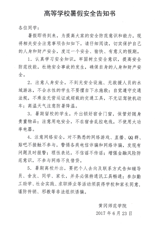 暑假即将来临,为做好暑假前后学生教育与管理工作,让广大师生度过一个“安乐、祥和、健康、安全”的假期,现将有关工作要求及事项通知如下: