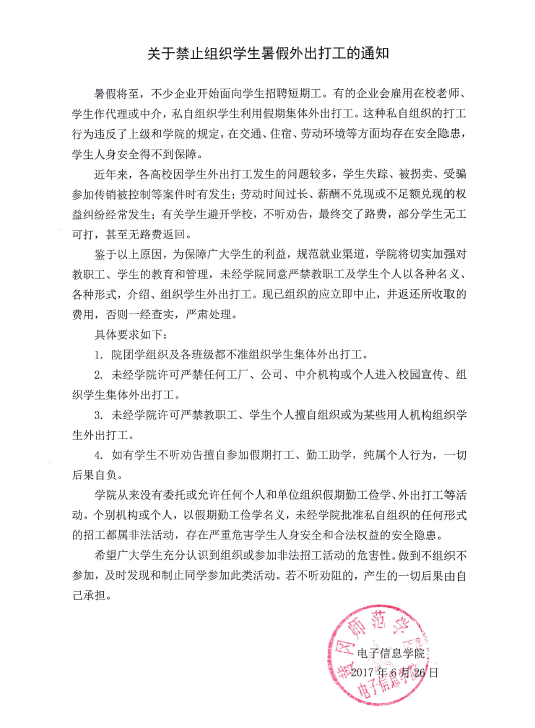 4.考虑到2016级学生暑期参加专业实践月活动,各班要在学院召开动员大会的基础上,认真排查不安全因素,出发前有针对性地对学生进行一次安全教育,确保教育提醒到位、实习保险购买到位、实习安排告知家长到位。