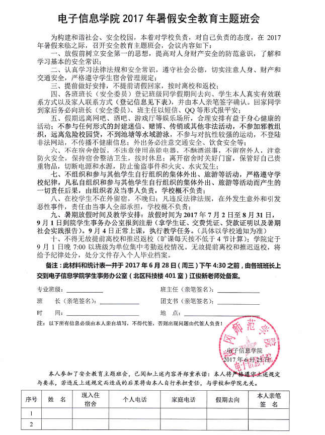 6.为加强教育和管理,保障毕业生顺利毕业,2014级各班放假前要组织学生签订《电子信息学院2018届毕业生安全责任协议书》。