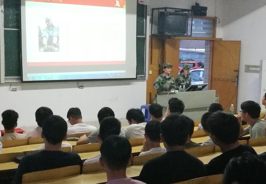 江俊新老师首先让大家观看了学校的征兵入伍的视频并强调了大学生从军的优势。接下来,两位退役学长用自己的经历为大家讲述了在部队的感触,两位学长提出,从军不仅获得经济补助、强身健体而且有助于养成良好的作息习惯,更重要的是对党的信念有所升华;而两位在役学姐则为大家介绍了如从军地域的区别、退役后回归校园的可能等一些从军事项,并为在场同学所提出的的从军问题做出回应。随后,武装宣传部的两位学长为大家宣传了当兵的好处、优惠政策、报名流程、部队的训练项目以及作息时间等。