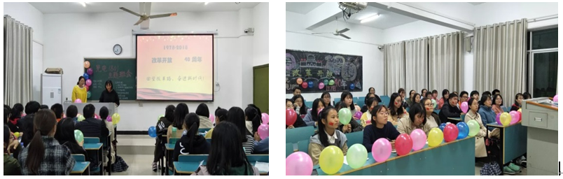 为了使青年学生更多的了解改革开放的历史进程、重大意义、深远影响,进一步凝聚起青年学生支持、参与全面深化改革的思想共识,继续沿着改革开放的康庄大道奋勇前进,从而为实现两个百年目标而努力奋斗。我院以习近平新时代中国特色社会主义思想为指导,贯彻落实“以学生为中心”教学理念,积极推动思想政治理论课教学改革,开展了“纪念改革开放四十周年”主题班会。