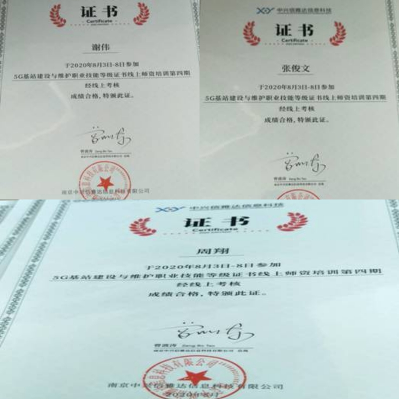 williamhill中国在暑假期间组织相关老师(谢伟,张俊文,周翔)参与了5G基站建设与维护职业技能等级证书师资线上培训(8月3日-8日)并参加测试,获得师资培训证书。张俊文老师于8月24日-31日到重庆电子工程职业学院国培基地参加了1+X 5G基站建设与维护线下培训并结业。