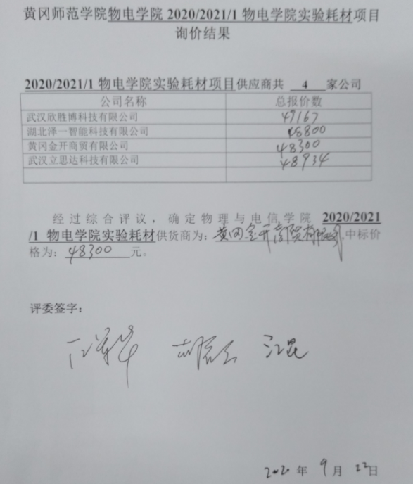 William威廉希尔物电学院2020年秋季第一次实验耗材的采购招标工作从2020年9月13日启动,公开面向社会招标,并在学院网上公示,截止到9月20日共收到有效标书4份,于9月20日学院组织人员开标,开标结果为:黄冈金开商贸有限公司以人民币48300元的价格中标。在此表示祝贺。