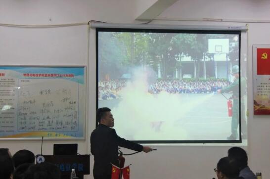 首先,陈教官结合重大火灾案例,就火灾危险性、火灾的预防与扑救、火场疏散、灭火器材的种类和使用、火灾逃生和自救等方面知识进行了形象生动地讲解。陈教官以火灾事故为切入点,通过一张张触目惊心的图片,对火灾发生的人为因素和工作隐患等原因作了深入分析,对“血的教训”警示大家要高度重视消防安全。还结合实际生活中的真实案例,详细介绍了日常生活中极易忽视的火灾隐患、各阶段扑救措施等知识。