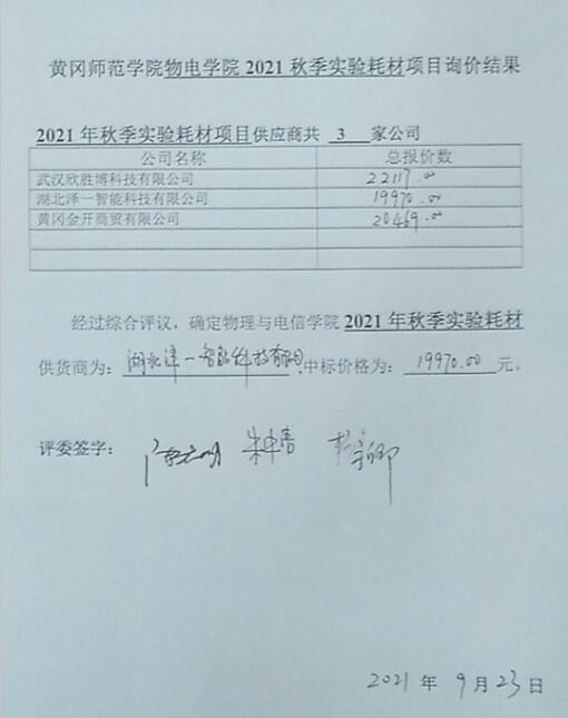 William威廉希尔物电学院2021年秋季实验耗材的采购招标工作从2021年9月10日启动,公开面向社会招标,并在学院网上公示,截止到9月18日共收到有效标书3份,于9月22日学院组织人员开标 , 开标结果为 :黄冈湖北泽一智能科技有限公司以人民币19970元的价格中标。