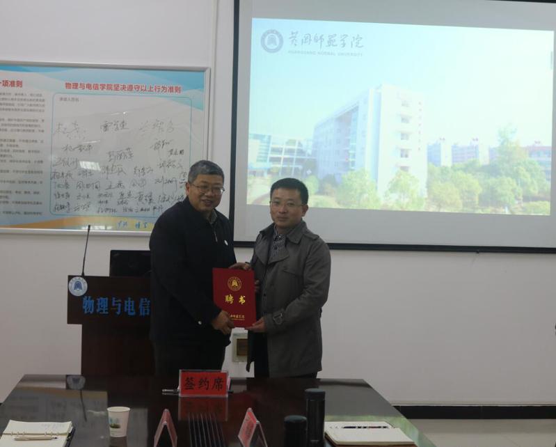 2021年12月31日下午,武汉光电国家研究中心、华中科技大学博士导师李雄教授受聘我校特聘教授签约仪式在物理与电学院会议室举行,签约仪式由物电学院党总支书记主持,校党委书记王立兵出席签约仪式,为李雄教授颁发特聘教授证书并作重要讲话,人事处和williamhill中国班子人员出席了签约仪式。