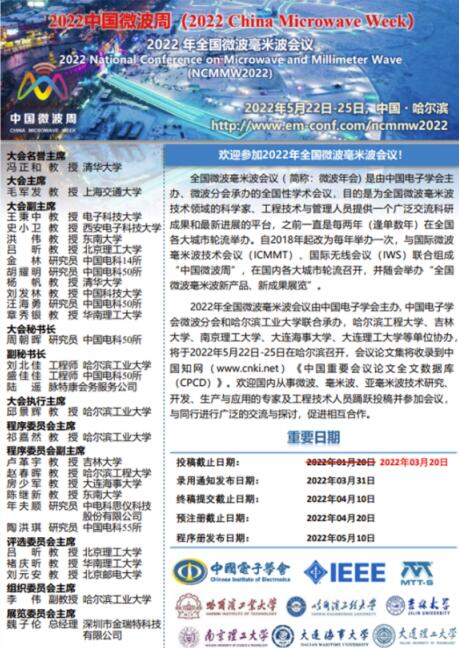 2022年中国微波周【2022年全国微波毫米波会议(中国微波年会)、2022年微波毫米波科技成果及产品展(MWIE2022)、2022年国际微波毫米波技术会议(ICMMT2022)和2022年国际无线会议(IWS2022)】,于2022年8月12日至15日在哈尔滨国际会议中心举行。