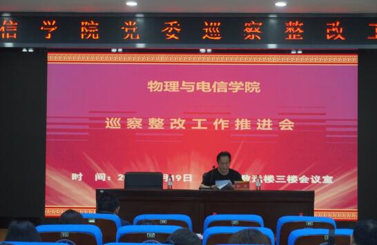 4月19日下午,物电学院在致远楼三楼会议室召开落实学校党委第一巡察组反馈意见整改工作推进会。院党委书记杜杰主持会议并讲话,全体教职工参加会议。