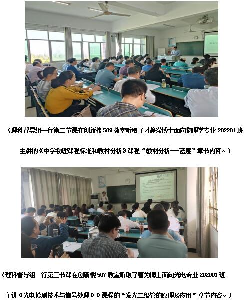 本次公开课由才静滢博士面向物理学专业202201班讲授《中学物理课程标准和教材分析》课程的“教材分析---密度”章节内容;新进博士曹为博士面向光电专业202001班讲授《《光电检测技术与信号处理》》课程的“发光二级管的原理及应用”章节内容。学校理科组督导员们分别从课前准备、导入新课、新课教授、教学重难点处理、师生互动、教学方法、课件制作、作业布置及对学生思想、方法和能力培养等方面进行了全面、精彩的点评,肯定了优点,指出了不足,提出了良好的建议。是两节成功的公开课, 两位博士教学态度认真负责,教学大纲、授课计划、教学设计和授课PPT准备齐全,规范,体现了青年博士严谨的学术素养;课堂教学思路清晰、教学重点突出、教学难点能够很好的突破,理论联系实际,联系学科前沿动态,注重科学思想和方法的传授,教态自然大方,语言流畅,师生互动课堂气氛活跃,展示了两位青年教师扎实的专业知识、较强的教师教育功底和熟练的课堂教学组织能力。希望每一位青年教师以此为契机,加强教师教育技能的学习,不断提升自己,努力提高教学艺术水平,成为教学名师。