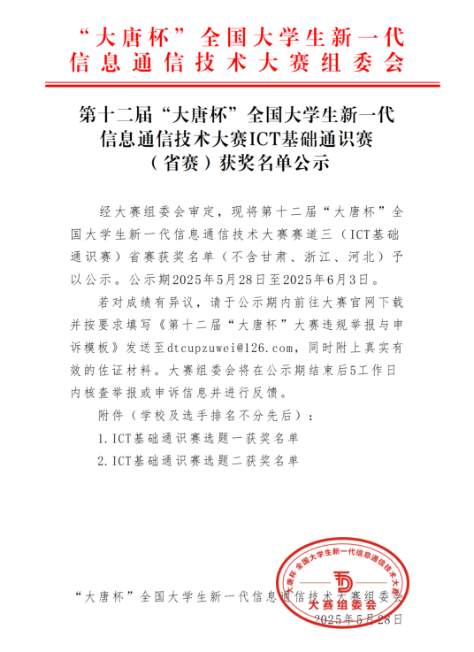 我院学子在2025年第十二届“大唐杯”全国大学生新一代信息通信技术大赛省赛中,斩获省一等奖1个,二等奖1个,三等奖3个,为学院赢得了荣誉,其中一等奖获奖队伍将代表学校参加线下国赛。