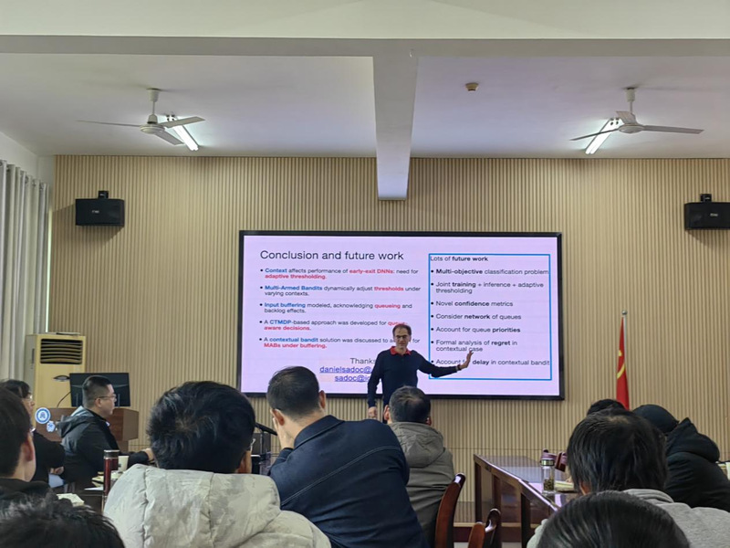 Daniel Sadoc教授我院师生带来了一场题为《早退机制神经网络:高效边缘推理的赌博机、缓冲区与系统思维》的精彩前沿报告。报告系统介绍了一项整合多项最新进展的创新研究,展示了如何将神经网络中的早退机制,从传统的静态启发式策略,演进为一种自适应、学习驱动且能感知队列状态的智能决策系统。Daniel Sadoc教授演示了在缺乏真实标签的严苛环境下,多臂赌博机模型如何动态调整退出阈值,以有效应对上下文变化、数据失真、概念漂移以及图像分类与自然语言处理等异构应用领域的多样化需求。随后,Daniel Sadoc教授将这些前沿思路与缓冲区感知控制相结合,深入论证了队列状态如何从根本上影响系统精度与延迟之间的关键权衡,并强调必须将其纳入早退策略的核心设计之中。